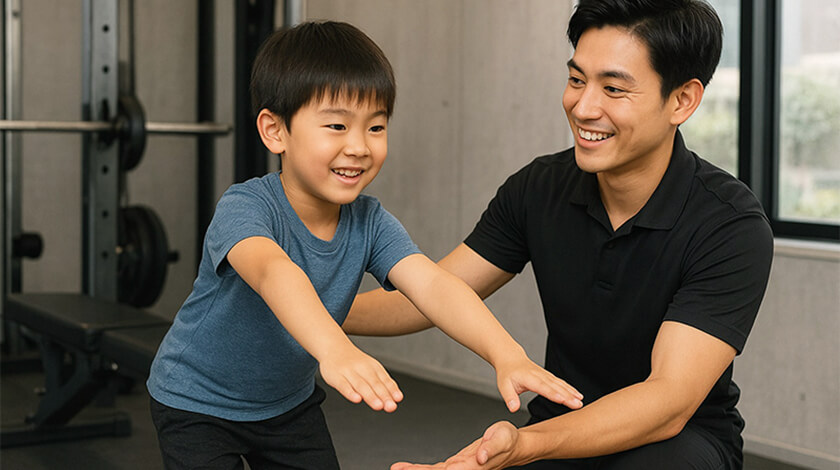 ⼦どもの⾻や筋⾁はまだ発達途中です。その時期に謝った姿勢や動きの癖がついてしまうと、成⻑後の腰痛や猫背、怪我のリスクにつながります。また、スマートフォンやゲームが普及している昨今において、⼦どもの体⼒低下、姿勢の崩れ、集中⼒の低下が増えていると⾔われています。パーソナルトレーニングでは、⼀⼈ひとりの⼦どもの体 格・運動能⼒・性格に合わせて、「楽しみながら正しくカラダを動かす⽅法」を伝えていきます。